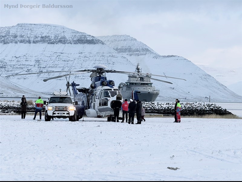 Þyrla Landhelgisgæslunnar kemur inn til lendingar Varðskipið Freyja i bakgrunni mynd Halldór Sveinbjörnsson